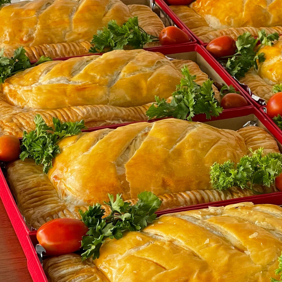 perfect for your small gatherings- seasoned grounded chicken meat with smoked beef and eggs. wrapped in flaky and crispy puff pastries.125. eachsize: