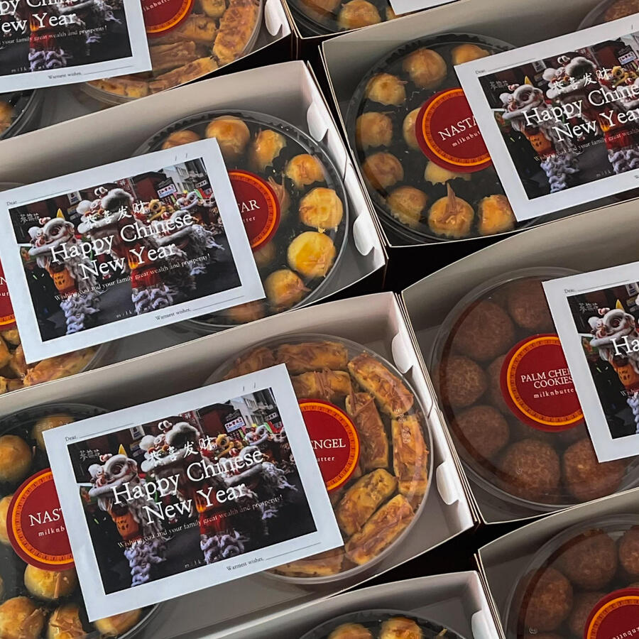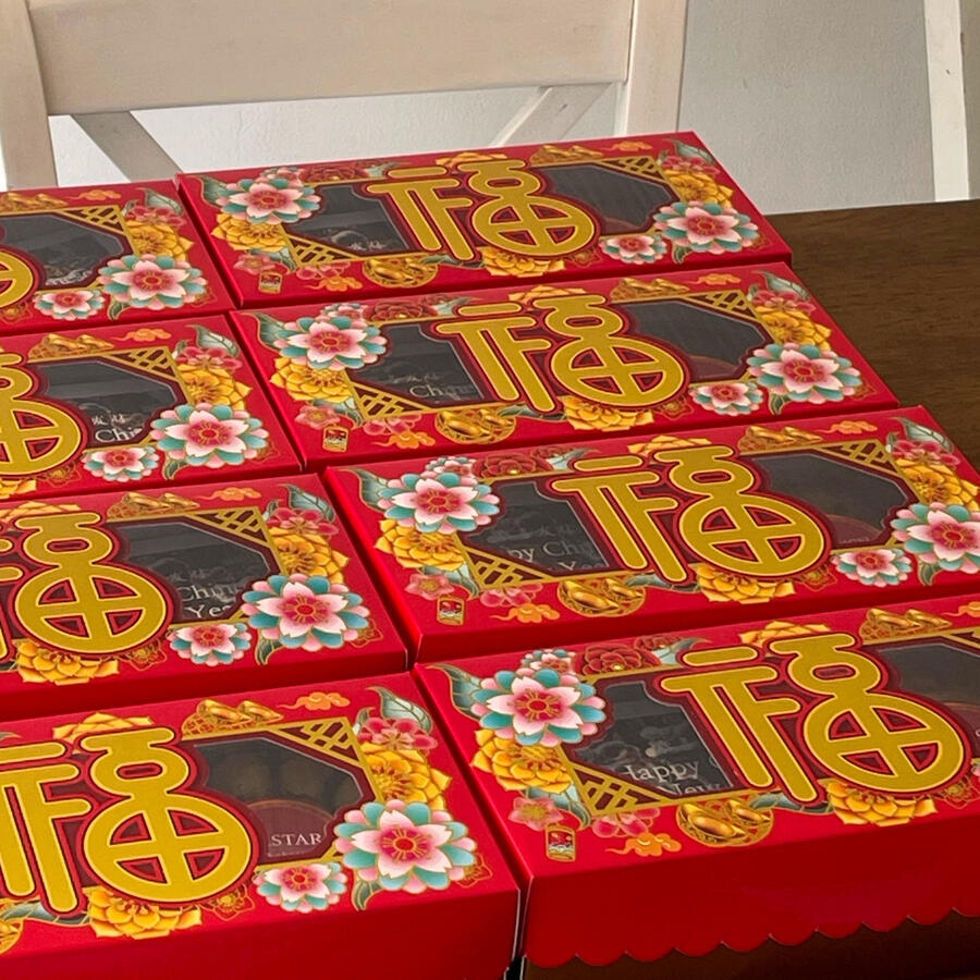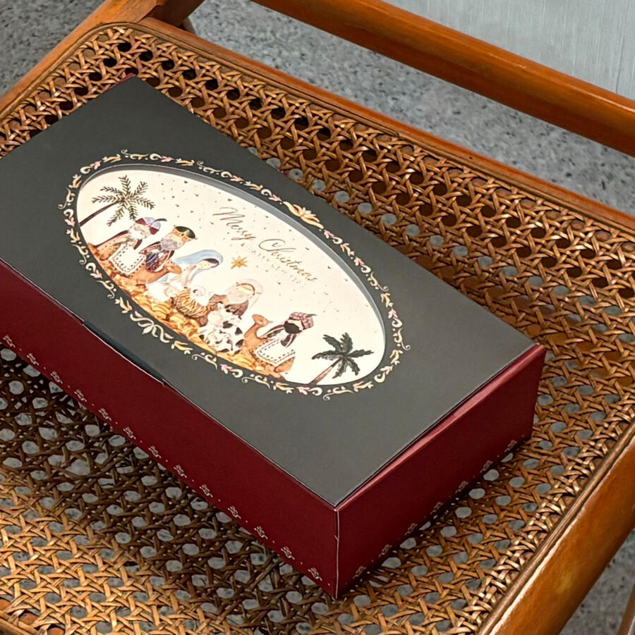 price includes: a Christmas design of your choiceChristmas-themed gift card, 20x20x8 ivory box, pita merah, a plastic knife.