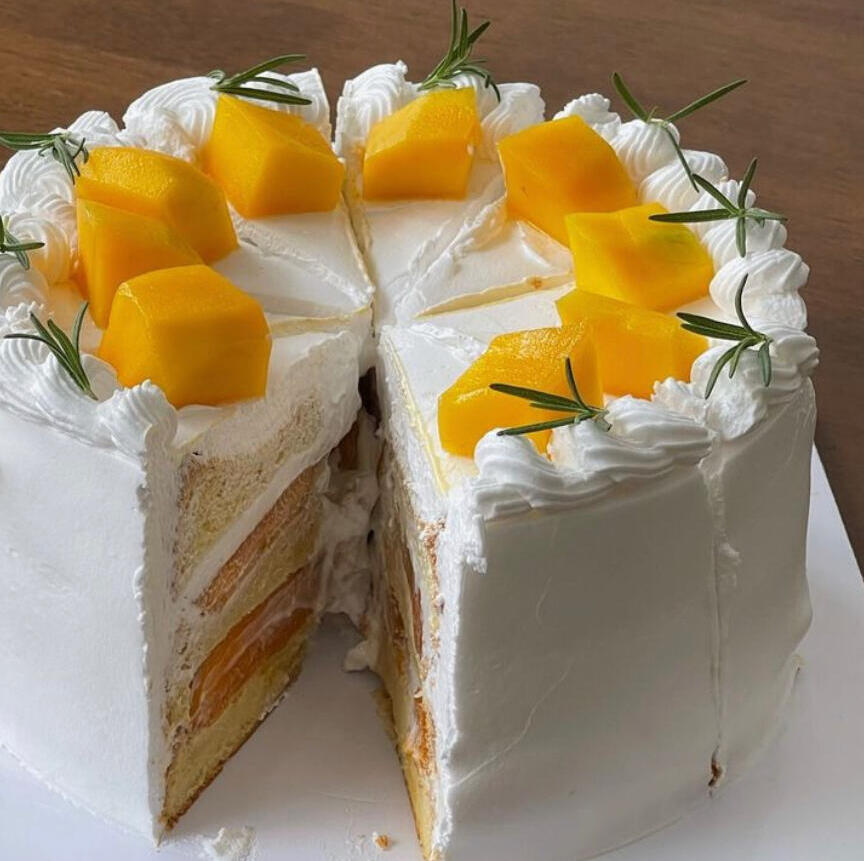3 layers of sponge cake with fresh cream and mango chunks. d20/ h11-12 cm