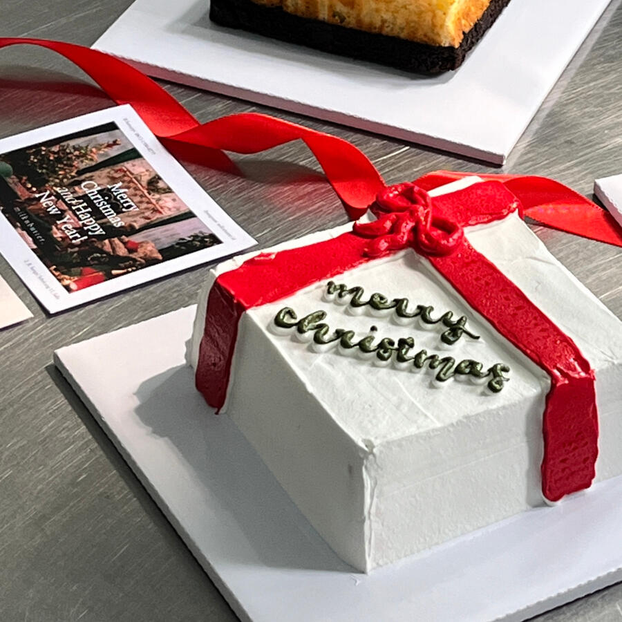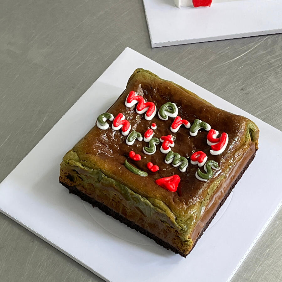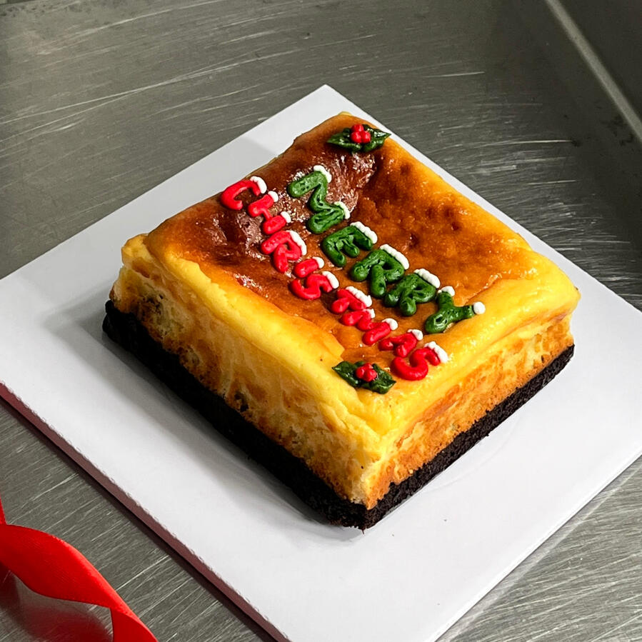 OUR CURRENT BEST SELLERsiapa yang udah cobain our sliced cheesecake brownie? yes, it is the same thing tapi beda ukuran yaaa -yang ini ukuran 12x12x5 cm. it's the same ooey-gooey goodness but make it MORE PRETTY! currently available in 2 design (obviously: the gift box design is our favorite!).also available in 2 flavors: the OG and matchaincludes: christmas design, a plastic knife, white box + red ribbons, gift card, christmas greeting card, a candle.