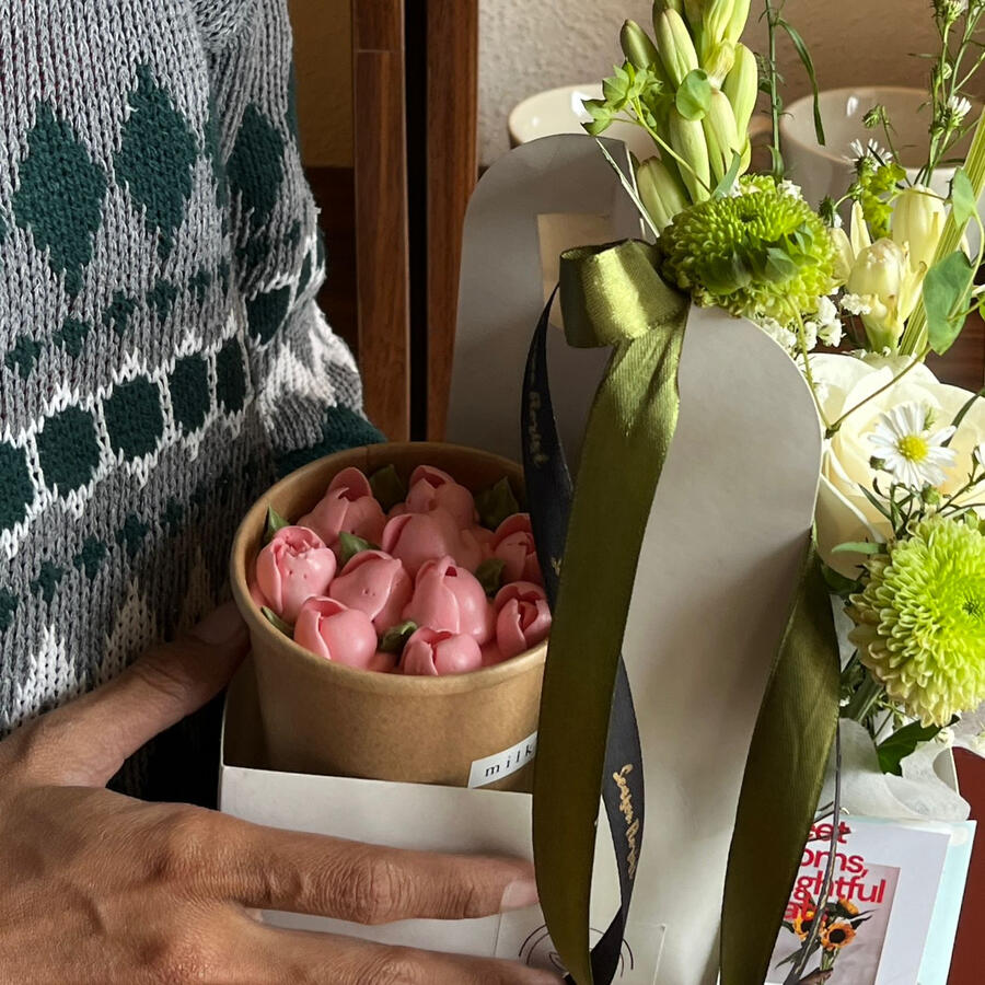 MINI-LOVE-TO-GO/ 130. per set"MINI LOVE TO GO" terbagi jadi 2 part, sisi yang diisi rangkaian bunga dari season florist dan buttercream cake-in-a-cup dari milknbutter. both rangkaian bunga dan bento cake bisa di custom, dari color pallete, hingga tulisan di cake! note: tulisan di cake maksimal 3 kataprices includes:rangkaian bunga (customizeable color and flower options), buttercream cake (customizeable), greeting cards, gable box packagingPICK UP POINTSeason Florist:
